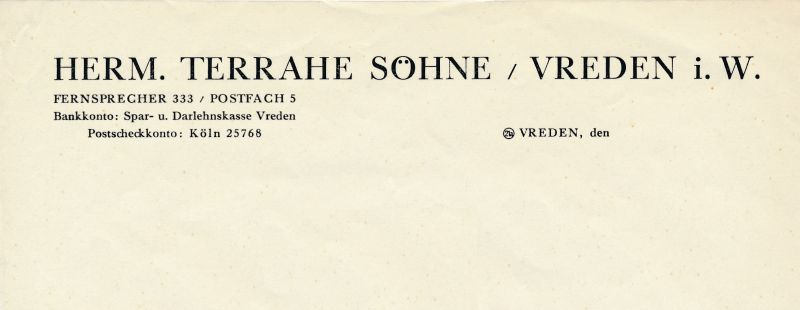 (Rechtsnachfolgerin der im "Firmen=Register" des königlichen Amtsgerichts Vreden am 2. Juni 1887 eingetragenen Firma Hermann Terrahe, Vreden.)